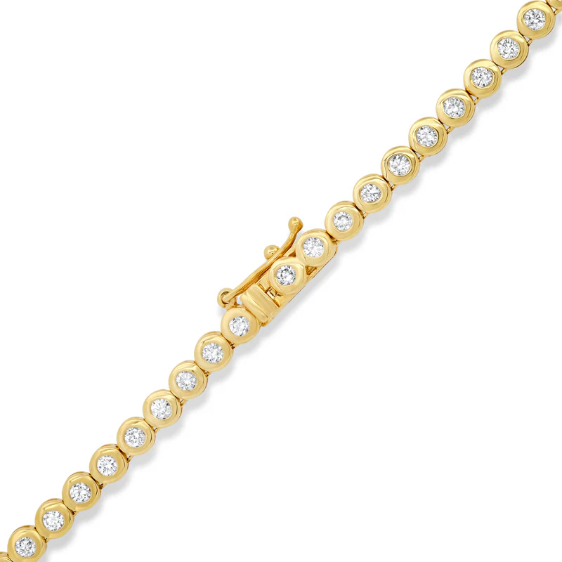 Crafted in 18-karat yellow gold, our Diamond Bezel Tennis Necklace is set with 4.95 carats of brilliant cut, round white diamonds and makes a stunning statement when worn alone or layered with other necklaces from our collection. Wear yours everyday, because diamonds are always a good idea!