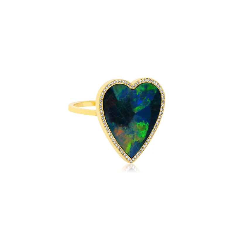 Handcrafted in 18-karat yellow gold, this statement making heart ring is set with pastel hued opal inlay and framed by shimmering pavé diamonds. A symbol of love, wear the forever piece to elevate your everyday, signature look. Each natural stone is one-of-a-kind and may vary slightly from piece to piece.
